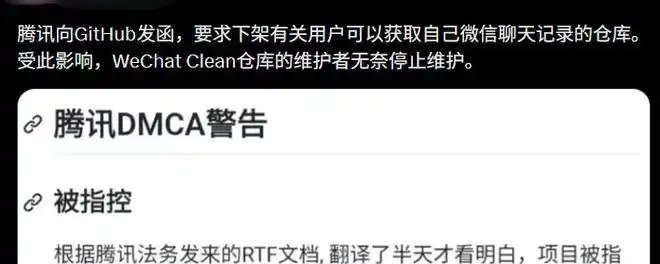 事件背景:2026年1月18日左右据多家媒体曝光:腾讯法务部门依据《数字千年版权法》(DMCA)向 GitHub发起了投诉,以“非法绕过技术保护措施”及侵犯知识产权为由,强制下架了包括 WeChat Clean 在内的约30款开源微信聊天记录导出与分析工具,此举迅速引发了技术圈关于“用户数据主权”与“反垄断”的激烈争议。讨论热度在知乎上尤为热烈,当前已上热榜一,有高达 2000万热度。以下是本问题下最高赞的回答,此观点很有价值,故分享给大家。 很多人被大厂的公关辞令吓住了,以为这些开源工具是什么黑客软件,是什么木马病毒。作为一个老架构师,我可以负责任地告诉你,GitHub 上那些被封杀的高星项目,技术原理简单到令人发指。微信在手机本地存储聊天记录,用的是 SQLite 数据库,为了所谓的安全,他们用 SQLCipher 这种开源方案给数据库加了一层密。 这个加密的秘钥在哪?就在你自己的手机里。通常是你的 IMEI 码加上微信 ID 的某种哈希算法生成的。 这些被下架的工具在做什么?它们只是模拟了这个算法,算出了原本就属于你的那把钥匙,然后打开了存储在你本地手机上的那个锁,把里面的文字、图片、语音提取出来,存成你能看懂的网页或者文档。 注意到了吗?全程没有联网,没有上传服务器,代码是开源透明的。如果说这叫泄露隐私,那你自己打开微信查看聊天记录算不算泄露隐私? 法务部拿着DMCA 数字千年版权法的大棒挥舞,理由是这些工具绕过了技术保护措施。这在法律条文上或许能自圆其说,毕竟反向工程在版权法里一直是个灰色地带。但在技术伦理上,这就是典型的降维打击。他们不是因为代码抄袭起诉开发者,而是因为开发者给了用户一把手电筒,让用户看清了自家地窖里到底存了多少粮食。 他们害怕的根本不是安全问题。如果是为了安全,微信大可以把本地数据库的加密算法升级成动态秘钥,或者绑定硬件指纹,技术手段多得是。他们真正害怕的,是数据可迁移性带来的护城河崩塌。 这件事情发生得毫不意外,甚至可以说,它来得太晚了。如果你真的看懂了腾讯这家公司的底层商业逻辑,看懂了所谓国民级APP的护城河究竟是由什么构成的,你就不会对法务部的重拳出击感到惊讶。 那些还在讨论开源协议、讨论技术无罪、讨论DMCA适用性的人,其实都还在表层打转。这根本不是一个法律问题,也不是一个技术问题,这是一个关于数据主权和数字资产定价权的政治经济学问题。 我们先抛开那些冠冕堂皇的理由。腾讯法务给Github发函,理由无非是涉嫌反编译、侵犯知识产权、危害信息安全。这些理由在法律层面上或许站得住脚,毕竟腾讯在用户协议里写得清清楚楚,数据归平台所有,用户只有使用权,而且严禁任何形式的反向工程。但在逻辑层面上,这简直就是一种巨大的荒谬。 我们每个人现在的微信里躺着什么? 是过去十年的社交关系,是逝去亲人的语音,是工作留痕的证据,是还没来得及备份的合同,甚至是你和恋人从相识到分手的全过程。对于绝大多数中国互联网用户来说,微信聊天记录不再是简单的缓存文件,它是我们个人数字生命的核心载体。可以说是我们外挂的大脑记忆体。 那个被下架的开源工具 WeChat Clean,或者是其他类似的导出工具,它们解决了一个什么痛点?它们解决的是微信作为一个超级 APP,在不断膨胀的过程中,对用户设备存储空间的无度索取,以及对用户数据管理权利的彻底剥夺。微信现在的体积已经庞大到了令人发指的地步,动辄几十G甚至上百G的占用,被称为3A大作都不为过。而它提供的清理功能不仅弱智,而且极其不透明。用户想把属于自己的记忆导出来,存到自己的硬盘里,做成 PDF也好,做成本地数据库也好,以便于检索和永久保存,这难道不是天经地义的需求吗? 但在腾讯眼里,这不仅不是需求,反而是威胁。 为什么?这里就要谈到那个残酷的底层逻辑了。 互联网平台的估值核心,从来不是代码,而是数据,以及将用户锁定在围墙之内的能力。微信之所以不可替代,不是因为它好用,甚至不是因为人多,而是因为它构成了事实上的关系链垄断和数据黑洞。数据只进不出,这是所有垄断性平台维持统治的基石。 一旦允许用户极其方便地、低成本地导出聊天记录,就会发生两件事。 第一,用户的迁移成本归零。如果我可以一键把十年的聊天记录导出,并且无缝导入到 Telegram、Signal 或者任何一个新兴的即时通讯软件中,那么微信的社交壁垒瞬间就会崩塌一半。只要有一个更好用的聊天软件出现,用户就没有了“舍不得聊天记录”这个最大的顾虑。这是腾讯绝对无法容忍的底线。所以它必须把数据锁死在自己的私有格式里,锁死在自己的沙盒里。 第二,数据的次生价值被剥夺。AI技术已经渗透到了每一个角落。我们每个人都想拥有一个基于个人数据的 AI助理。这个助理需要学习我过去的对话风格、了解我的工作历史、熟悉我的社交圈层。训练这个私人AI最好的语料库,就是我过去十几年的微信聊天记录。 如果这些开源工具泛滥,用户就可以把这些高价值语料提取出来,在本地部署的开源大模型上训练自己的数字分身。这意味着什么?意味着腾讯失去了未来AI时代最大的筹码。腾讯希望的是,未来你想用 AI分析你的社交网络,你想搜索五年前的一句话,你必须使用微信内置的付费 AI服务,你必须把数据留在它的服务器上,让它喂养它的闭源大模型。 